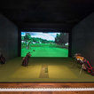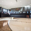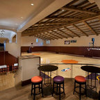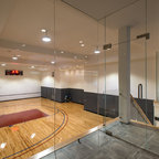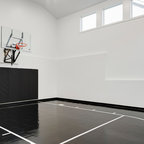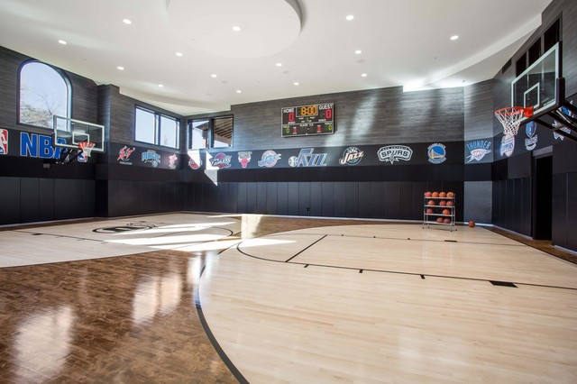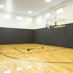 Expansive contemporary indoor sports court in Salt Lake City with black walls, light hardwood flooring and beige floors. — Houzz