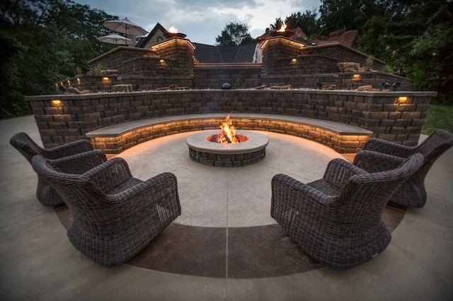 Large traditional back patio in Cedar Rapids with a fire feature, concrete slabs and no cover. — Houzz
