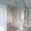 Design ideas for a large classic ensuite bathroom with shaker cabinets, grey cabinets, a freestanding bath, a built-in shower, a one-piece toilet, white tiles, metro tiles, blue walls, porcelain flooring, a submerged sink and engineered stone worktops. — Houzz