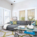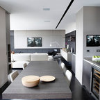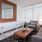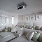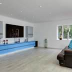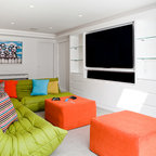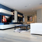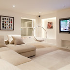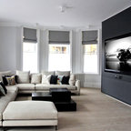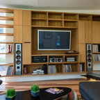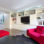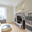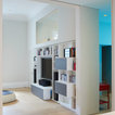 Go wall to wallMake room for all your media paraphernalia by using the whole of the wall space available. This series of shelves and cupboards has enough room for the television, boxes and even speakers. The key to making a large area of storage like this look neat and attractive is to plan the size of each feature. The ground-level recesses perfectly fit the speakers, for example, and the two grey cabinets line up with the adjacent TV.