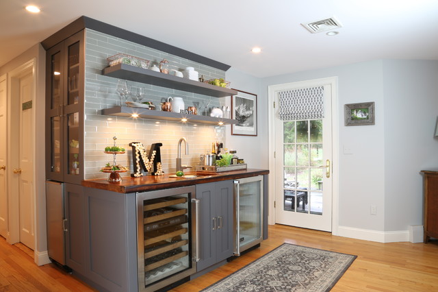 Inspiration for a medium sized classic single-wall wet bar in Other with a submerged sink, open cabinets, grey cabinets, wood worktops, grey splashback, glass tiled splashback and medium hardwood flooring. — Houzz