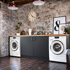 Farmhouse utility room in Gloucestershire with a submerged sink, recessed-panel cabinets, white cabinets, wood worktops, white walls, light hardwood flooring, a side by side washer and dryer and brown worktops. — Houzz