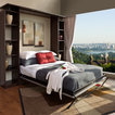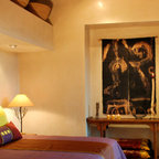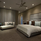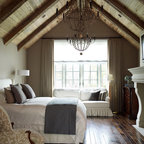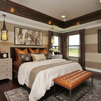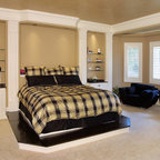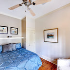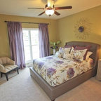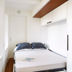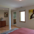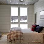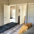 Small contemporary guest bedroom in Burlington with brown walls, laminate floors, no fireplace and brown floors. — Houzz
