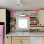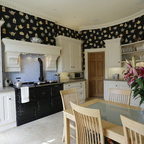 Line the wallsHere’s how to beautifully combine a contemporary Scandi kitchen with some cosy, retro-style elements. The black, flat-fronted kitchen units and modern pendant are sleek and functional, but they’ve been combined with floral wallpaper, pink surfaces and plenty of vintage knick-knacks. The finished kitchen is wonderfully quirky and unique.