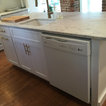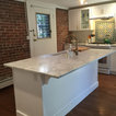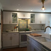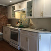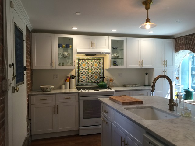 Small traditional l-shaped kitchen/diner in New York with a submerged sink, shaker cabinets, white cabinets, marble worktops, multi-coloured splashback, mosaic tiled splashback, white appliances, light hardwood flooring and an island. — Houzz