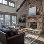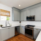 Photo of a medium sized farmhouse l-shaped open plan kitchen in Bridgeport with a belfast sink, raised-panel cabinets, grey cabinets, composite countertops, window splashback, stainless steel appliances, medium hardwood flooring, an island, brown floors and black worktops. — Houzz
