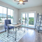Design ideas for a large classic study in San Diego with grey walls, light hardwood flooring, no fireplace, a built-in desk and beige floors. — Houzz