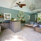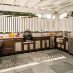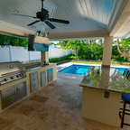 This is an example of a traditional back patio in Houston with an outdoor kitchen, tiled flooring and a roof extension. — Houzz