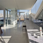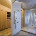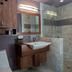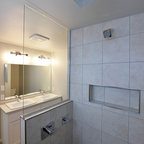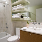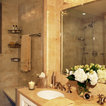The use of soft grey marble in tiles and mosaic add the needed texture and interest make this small bathroom seem larger.