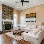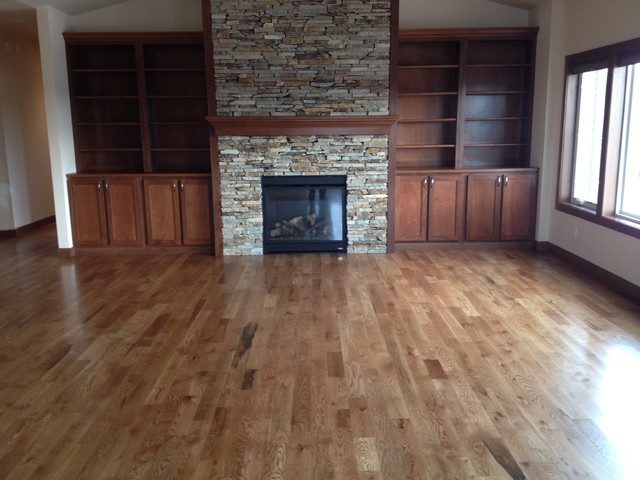 Design ideas for a medium sized contemporary enclosed family and games room in Cedar Rapids with beige walls, light hardwood flooring, a standard fireplace, a stone fireplace surround and no tv. — Houzz