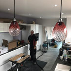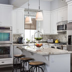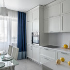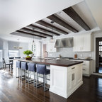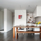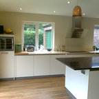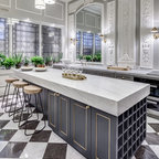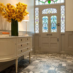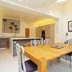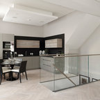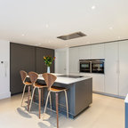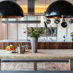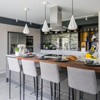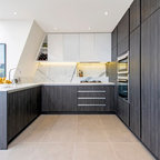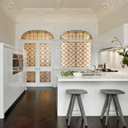 Add interest to minimalismPattern is a wonderful way to warm up a minimal look that might otherwise verge on the clinical. The clean lines and plain colours of this slick kitchen really stand out against the tiled floor, which brings an Arts and Crafts edge to the room. This is echoed by the line of kitchen utensils and pans that hang against the far wall.