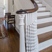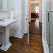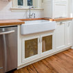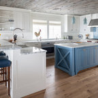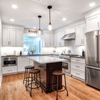 Photo of a large traditional u-shaped kitchen/diner in Atlanta with a belfast sink, white cabinets, white splashback, stainless steel appliances, an island, shaker cabinets, wood worktops, metro tiled splashback and medium hardwood flooring. — Houzz