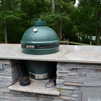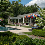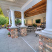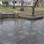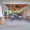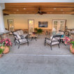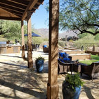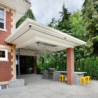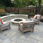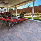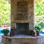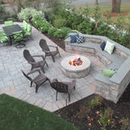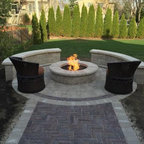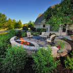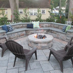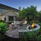 Design ideas for a large classic back patio in Cedar Rapids with a fire feature, stamped concrete and a roof extension. — Houzz