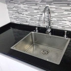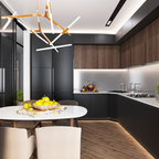 This is an example of a small modern u-shaped open plan kitchen in Seville with flat-panel cabinets, a breakfast bar, a submerged sink, white cabinets, engineered stone countertops, grey splashback, stainless steel appliances and medium hardwood flooring. — Houzz
