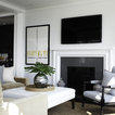 Black back wall, dark real fireplace, artwork above built-ins