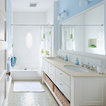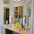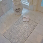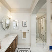 In the new Family Bath, painted walls and woodwork keep the space bright while the Anne Sacks marble mosaic tile pattern referenced throughout creates a continuity of color, form, and scale. Design elements such as the vanity and the mirrors give a more contemporary twist to the period style of these elements of the otherwise small basic box-shaped room thus contributing to the visual interest of the space.