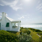 SeaBend is sited dramatically on a bluff, embracing a commanding view of a New England. The house is long and narrow, mostly one room deep, so that all the major rooms are open to both the north water views and the south sun, with breezes blowing through. The plan is geared to informal living, with the kitchen in the center to serve both indoor and outdoor living areas.