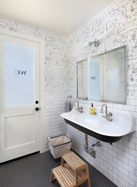 Photo of a rural family bathroom in San Francisco with a trough sink, white tiles and metro tiles. — Houzz