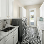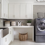 Top features required: Black/grey and white colour scheme High cupboard with shelves: each shelf with space for 2-3 pairs of wellington/snow boots (in this photo) white basin sink with tap (in this photo) washing machine and dryer close together Cupboard space for cleaning materials (jars, bottles, sponges) Tall vertical radiator that has enough space to place a clothes airer with clothes to dry Good lighting (natural and artificial) Window sill for potted plants. Space for laundry baskets