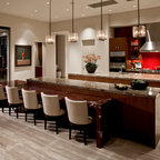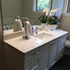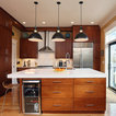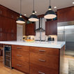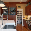 In this major kitchen remodel, we switched the locations of a half bath and a kitchen pantry, and gave an outdated and poorly laid out kitchen a total upgrade, including creating a better work triangle for people who actually cook in their kitchens. A spare, modern aesthetic was used with warm wood tones to offset the white counters.