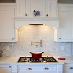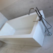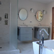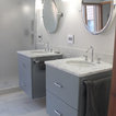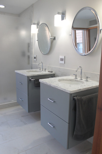 Floating vanities and glass shower walls allow for this bathroom to feel open and inviting. The freestanding JASON tub is a show stopper and the Kohler faucets tie this large bath together from one end to the other.