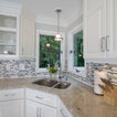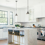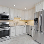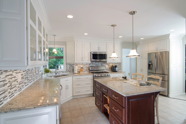 Design ideas for a medium sized classic l-shaped kitchen/diner in New York with a double-bowl sink, raised-panel cabinets, white cabinets, granite worktops, multi-coloured splashback, matchstick tiled splashback, stainless steel appliances, ceramic flooring and an island. — Houzz