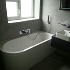 Book matched marble behind the free-standing bath helps to produce this striking state-of-the-art bathroom