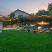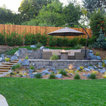 Outdoor seating area and retaining wall with prefabricated fire feature and native California plants. This design also includes a custom outdoor kitchen with a freestanding pergola.