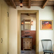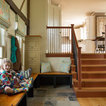 On the ground level of this 200-year old structure, a garage offers ample room for three cars, including one loaded up with kids and groceries. Just off the garage is the mudroom – a large but quaint space with an exposed wood ceiling, custom-built seat with period detailing, and a powder room. The vanity in the powder room features a vanity that was built using salvaged wood and reclaimed bluestone sourced right on the property.