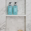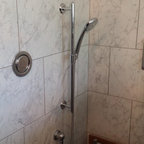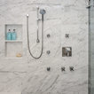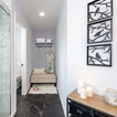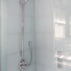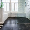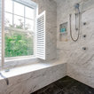 Knee wall and curbless shower entry, large-scale floor tile, slab walls in shower