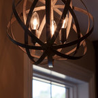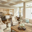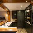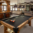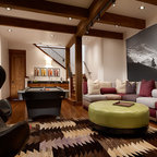 Cushy leather sofas, plaid pillows, wood barn doors and a reclaimed wood accent wall give cozy cabin style to this Minneapolis basement by Mark D. Williams Custom Homes. Box beams on the ceiling make sense of the challenges posed by soffits and ductwork (a common issue in basement spaces). And well-planned built-ins keep media equipment, games and books organized.