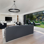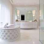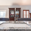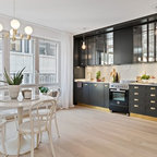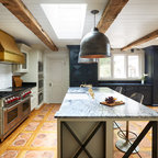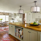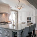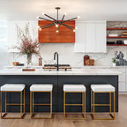 Still glamorous with a touch of traditional/farmhouse. Love the space for cookbooks in the island, and the color.