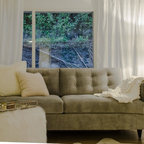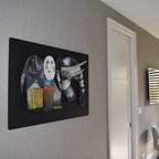 The glass topped desk in light enough to be easily moved against the far wall, opening up floor space to accommodate a queen size Murphy style wall bed that is built-in to a custom wall unit. Opening the coveted wall bed is always a highly anticipated event for everyone in the family.