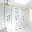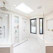 Photo of an expansive modern bathroom in San Diego with flat-panel cabinets, medium wood cabinets, a freestanding bath, a two-piece toilet, white tiles, glass tiles, white walls, marble flooring, a submerged sink, quartz worktops, white floors and an open shower. — Houzz